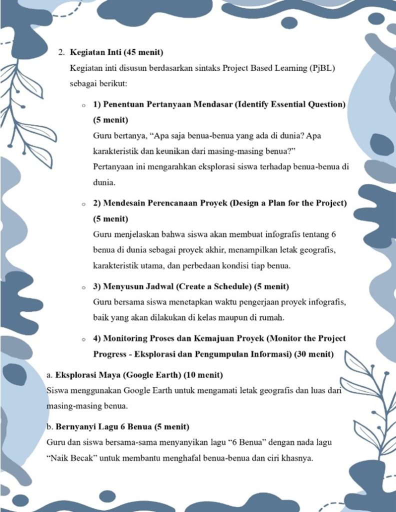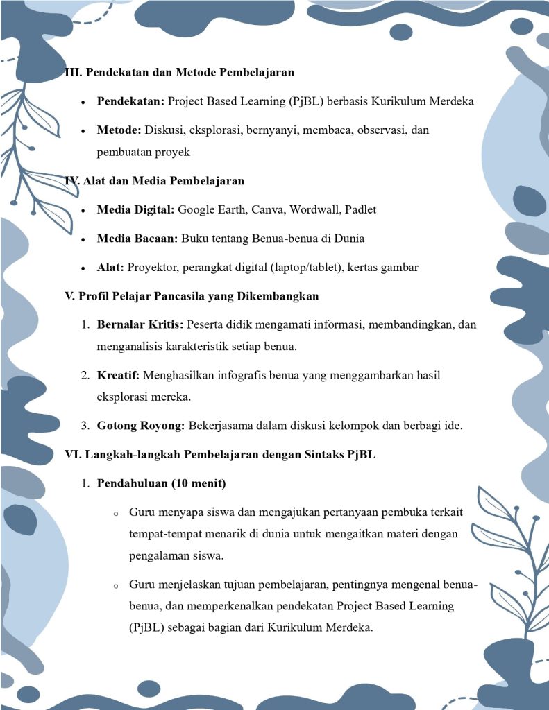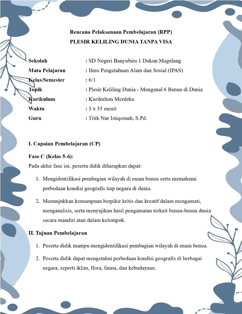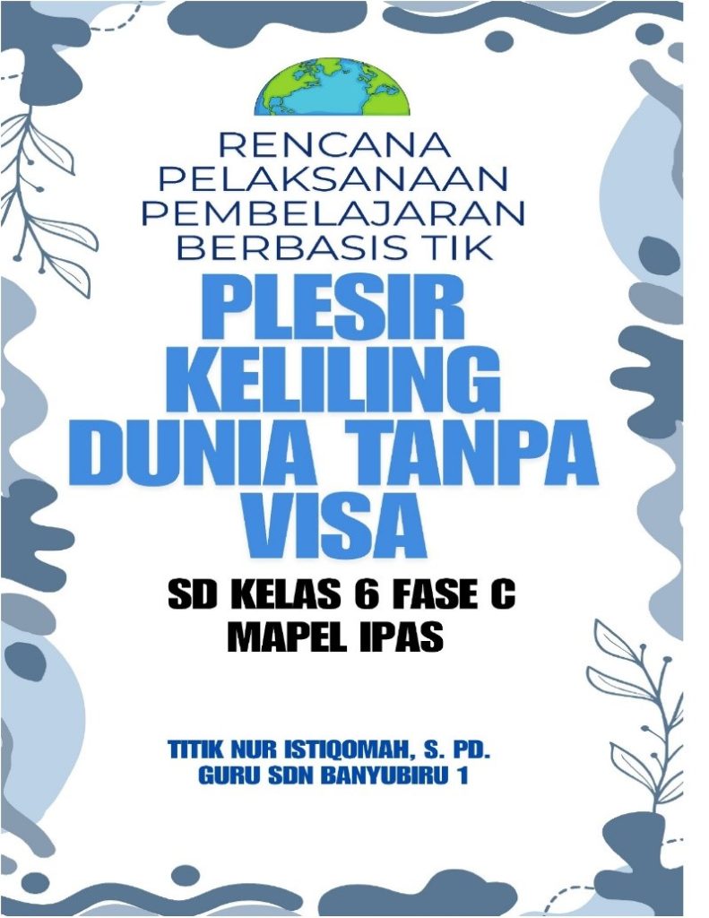 Di bawah ini merupakan Rencana Pelaksanaan Pembelajaran (RPP) Plesir Keliling Dunia Tanpa Visa yang kemudian saya terapkan di dalam kelas terintegrasi dengan penggunaan teknologi dan menggunakan model pembelajaran Project Based Learning (PjBL).