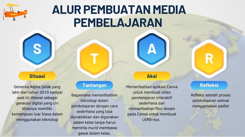 Rangkuman mengenai Alur Pembuatan Media Pembelajaran, Rencana Pelaksanaan dan Penerapannya dalam Pembelajaran di dalam kelas bisa disimak pada gambar dan link video di bawah ini. Saya membuat media pembelajaran “Video Interaktif 6 Benua di Dunia” dengan memanfaatkan aplikasi Canva melalui alur STAR (Situasi, Tantangan, Aksi, Refleksi) sebagai beirkut.