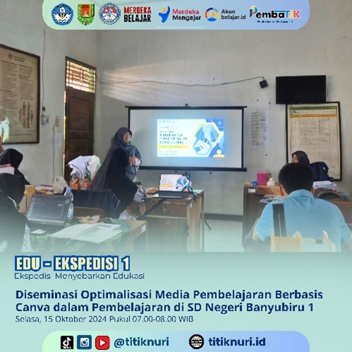 Pada Selasa, 15 Oktober 2024, saya berkesempatan mengisi kegiatan diseminasi bertajuk “Optimalisasi Media Pembelajaran Berbasis Canva dalam Pembelajaran” di SD Negeri Banyubiru 1. Kegiatan ini saya laksanakan di ruang kantor sekolah, dihadiri oleh 1 kepala sekolah dan 16 orang guru, yang semuanya antusias untuk meningkatkan kemampuan dalam mengintegrasikan teknologi di kelas.