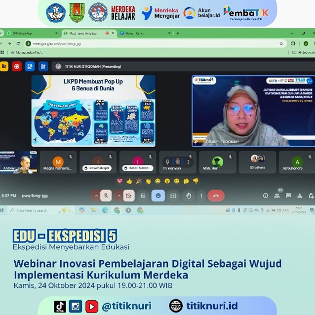 Pada kesempatan ini, Pak Aji berkesempatan untuk memaparkan tentang cara pembuatan Multimedia Pembelajaran Interaktif (MPI) dan penerapannya pada pembelajaran di jenjang SMA. Kemudian, saya berbagi penerapan video pembelajaran interaktif yang dibuat dengan memanfaatkan aplikasi Canva dan dikombinasikan dengan aplikasi wordwall dan Padlet dalam penerapannya di kelas jenjang Sekolah Dasar. Selanjutnya, Ms. Yohana juga menyampaikan penerapan video pembelajaran interaktif dalam pembelajaran Matematika di jenjang SMP.